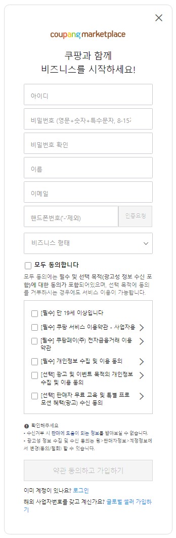 쿠팡 윙 판매자센터 회원가입