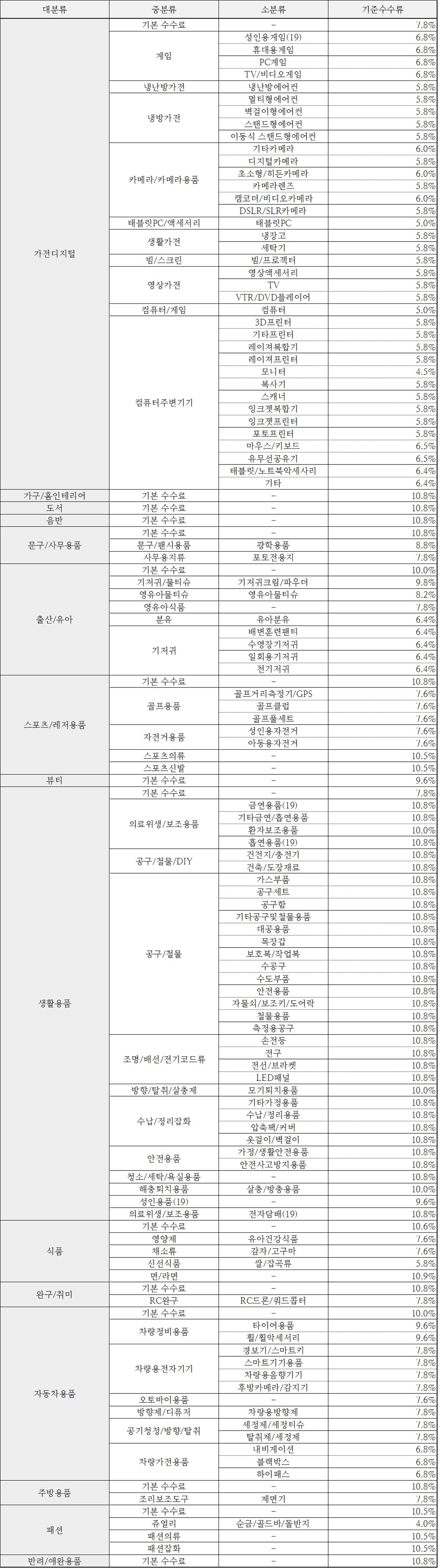 COUPANG MARKET PLACE WING 카테고리 별 판매수수료