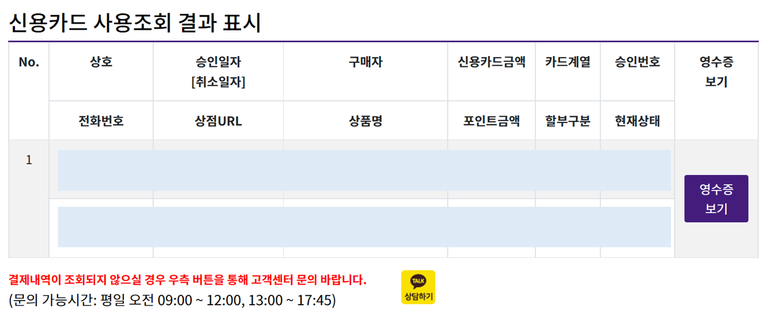 영수증 보기 버튼을 누르면 구매 시 입력한 정보를 입력하라는 창이 뜬다. 이메일 + 카드번호, 휴대폰 번호 + 금액, 구매자명 + 금액 세가지중 하나를 입력하고 확인 버튼을 누르면 온라인 신용카드 매출전표를 출력할 수 있다.